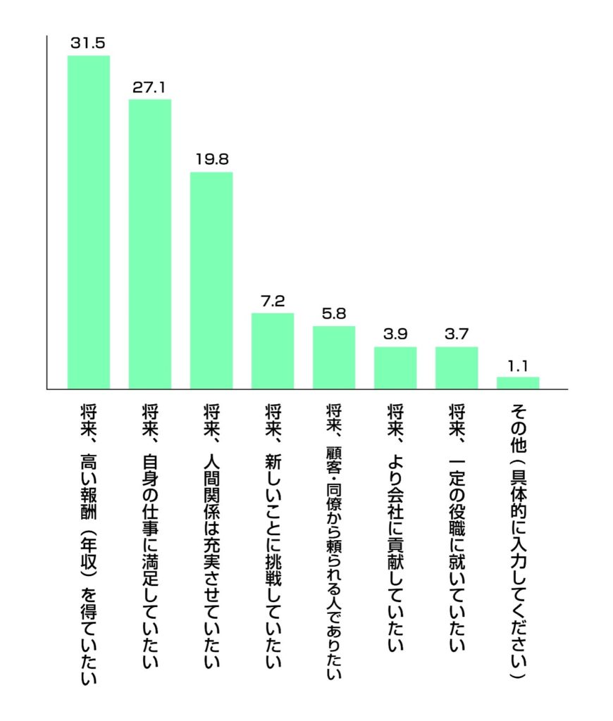 「将来高い報酬(年収)を得ていたい」(31.5%)と金銭報酬を重んじるものになりました。この傾向は、リ・カレントが独自調査を開始した2020年から共通しています。