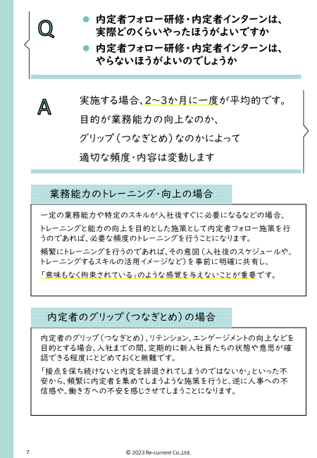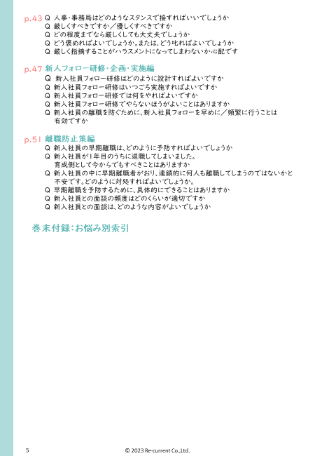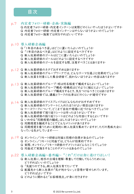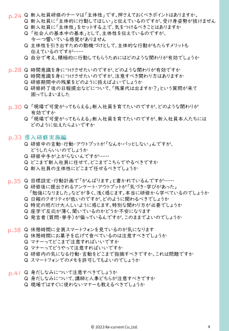 「新人研修百問百答」は、リ・カレント社がのべ382社の人材・組織開発のご支援を通じ蓄積してきた、新人研修の企画・実施・運営・フォローすべての工程についてのナレッジを集約したガイドブックです。