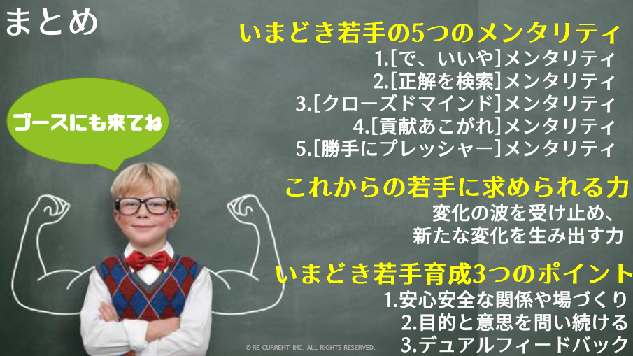 最後、フィードバックですね。彼らはフィードバックを求める人種になりますので、必ずやりっぱなしじゃなくて、適切なタイミングで適切なフィードバックをしてあげることです。問いかけと同時にフィードバックをするんですね。この基準に対して、これぐらいできたな、できないな、だから次こうするんだよというようなところを、昔は飲み屋で受けたんですね。私は飲み屋でそういう薫陶を受けたんですけど、今は早く帰らないといけない時代なので、明確にフィードバックをするという時間を管理職はつけなければいけない。