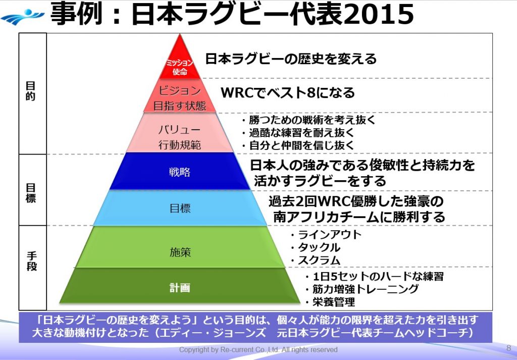 しかし、なぜ日本が南アフリカに勝てたか。先ほどのミッションから計画までツリーが本当に明確になって実行されたということが、いろいろと調べてみると分かります。木津選手が最後のアタックのときに言ったのが、「日本ラグビーの歴史を変える」というこのチームのミッションであったということです。
