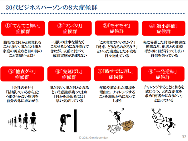 内村講師いわく、30代のビジネスパーソンにはキャリアに関する「8大症候群」が見られます。