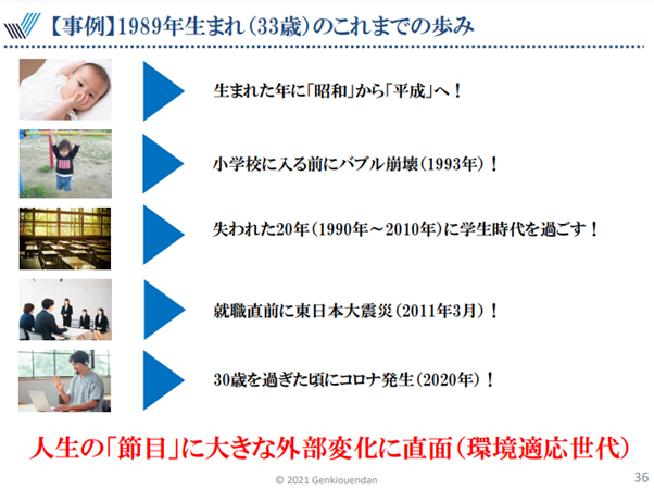 セミナーでは、1989年生まれのビジネスパーソンを例として、世代傾向が解説されました。
