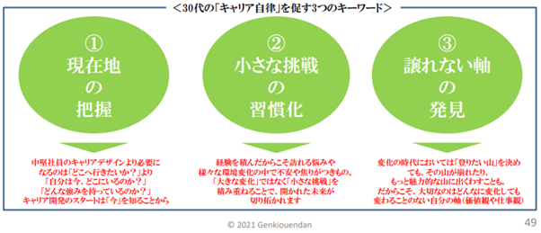 そんな中、30代は、がむしゃらに走ってきた20代とは異なり、一歩立ち止まって今後のキャリアを考えるタイミングです。彼ら彼女らのキャリア開発には、どのようなキーワードが重要なのでしょうか。