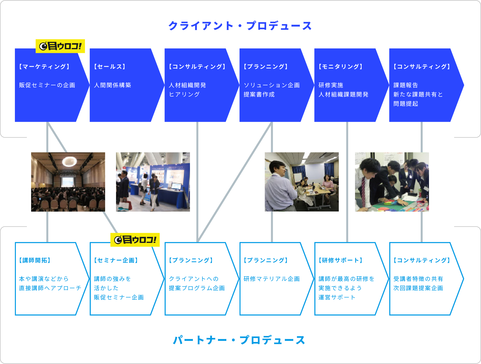 お客様であるクライアントの人材組織開発コンセプトをひとことで言い切ることができ、お客様の人材、組織の課題を解決するために、講師・プログラムを開発し提供しています。